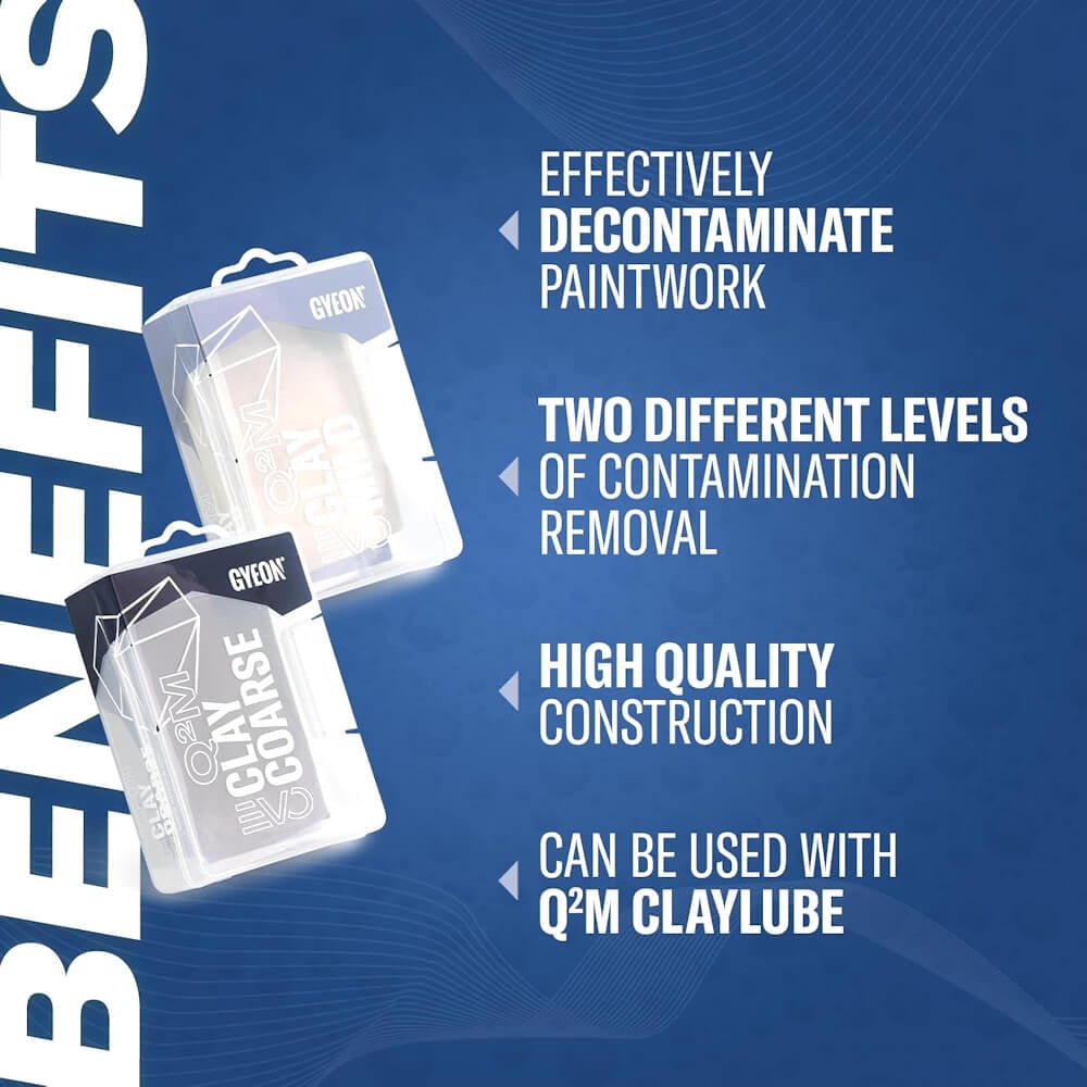 Argila decontaminare Gyeon Q²M Clay este solutia perfecta pentru indepartarea contaminantilor persistenti de pe suprafata vopselei. Ideala pentru detailingul in profunzime, aceasta argila auto este conceputa pentru a elimina depunerile, cum ar fi particulele de gudron, rasina, poluarea industriala sau resturile metalice.