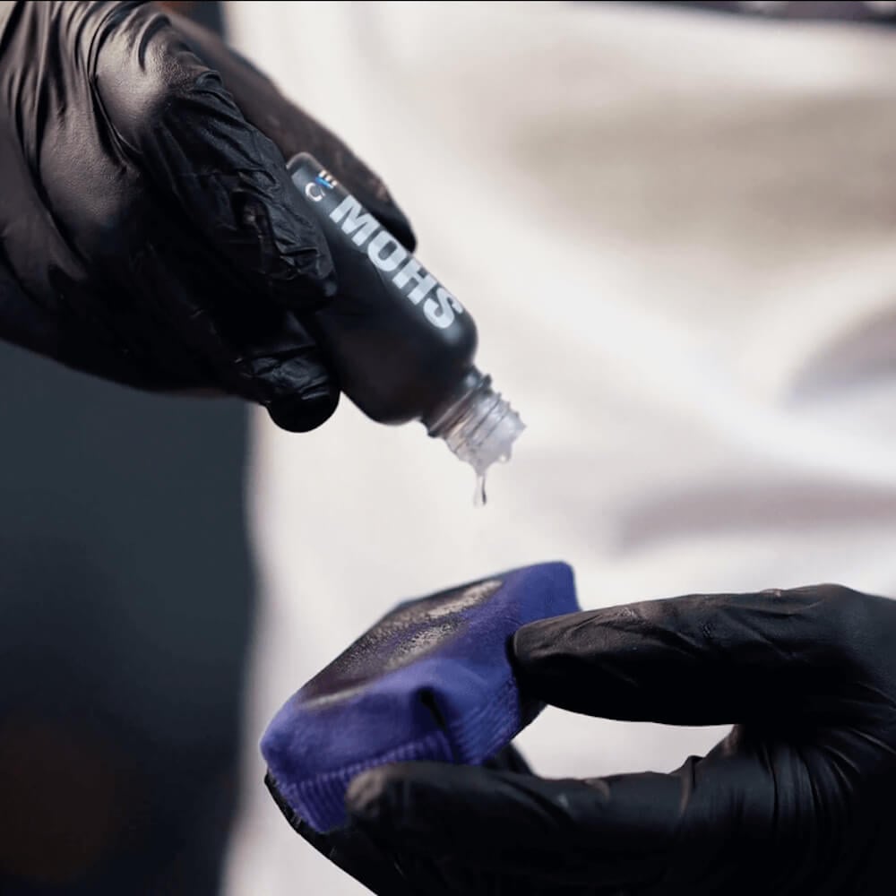 Aplicarea solutiei: Cu ajutorul aplicatorului inclus, aplica o cantitate generoasa de Gyeon Q² Mohs EVO pe suprafata vopselei pe pe elemente intregi de caroserie, in miscari liniare si uniforme de preferat, pentru un control cat mai bun al acoperirii intregii suprafete. Aplica pe suprafete mai mici de un element doar la temperatura si umiditate ridicate.