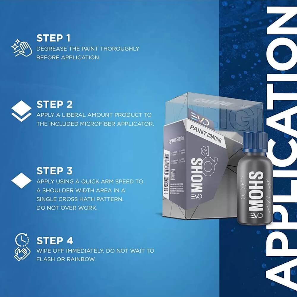 Aplicare in 2 straturi: desi Gyeon Q² Mohs EVO este o protectie ceramica intr-un strat, pentru extinderea efectului si a duratei de protectie, se poate aplica un al doilea strat. Aplica al doilea strat dupa minim 1 ora de la aplicarea primului strat, dar nu mai tarziu de 2 ore.